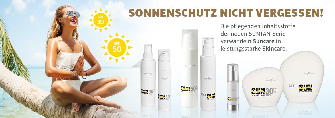 Die SUNTAN-Serie von MAXXIMAS verspricht strahlende Bräune für jeden Hauttyp, sogar für die sehr empfindliche Haut. Die modernen Formulierungen sind noch sinnlicher, wirksamer und lassen Rötungen und Reizungen gar nicht erst entstehen. Aloe Vera als Hauptwirkstoff ist perfekt für sonnenstrapazierte Haut. Die pflegenden Inhaltsstoffe der neuen SUNTAN-Serie verwandeln Suncare in leistungsstarke Skincare. Verwöhne und schütze deine Haut, damit du die Sonne unbeschwert genießen kannst: